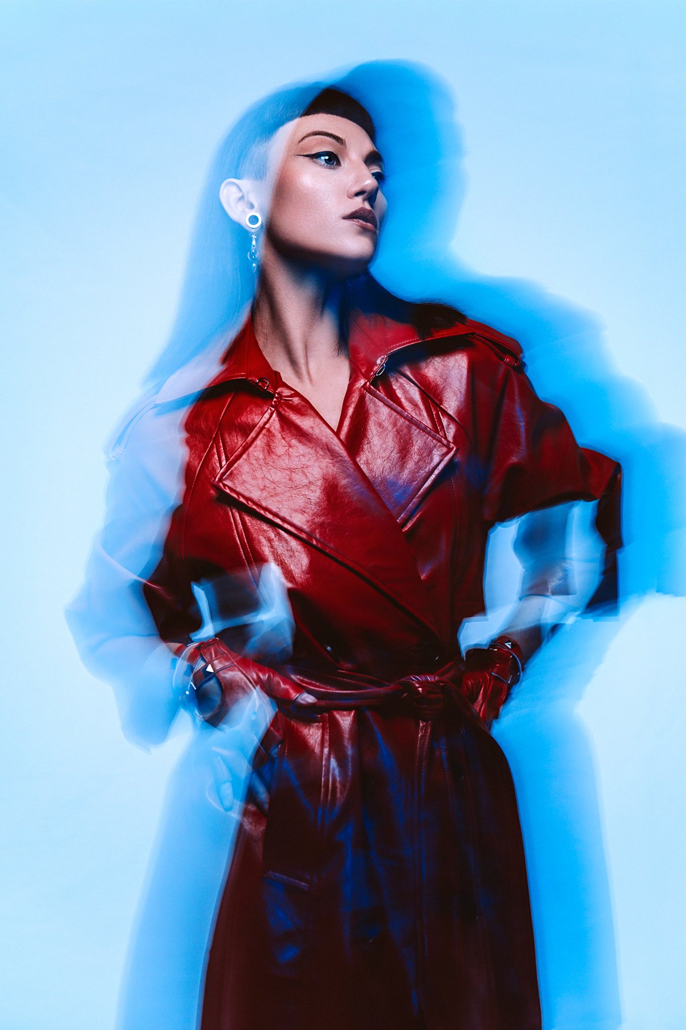So, to briefly recap what’s going on in the shot. The light above the model is flashing as soon as I press the shutter. This light captures a frozen image of the model in the frame. Behind me, the big blue umbrella with the L600C is also flashing, and that is also capturing a clean, frozen image of the model. Lastly, the light behind the model is always on, so when I press the shutter and the camera captures light for that 1/2 second, it’s seeing that bright white background behind the model and because I’m not shooting on a tripod, any movement I create with the camera during that time, is displayed as that blue ghosting effect around the edge of the model.